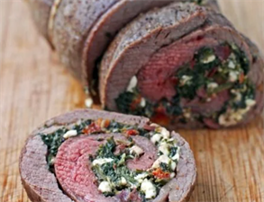 Enjoy a meal of Rustic Caprese Toast, Fresh Salad, Stuffed Flank Steak, Roasted Asparagus, and Strawberry Panna Cotta.