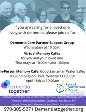 Join us for our Windsor in-person memory cafe. We will meet inside of Good Samaritan Society at Water Valley Independent Living (805 Compassion Dr. Windsor 80550) up the stairs or elevator and straight to the back dining room from 10-11 am.